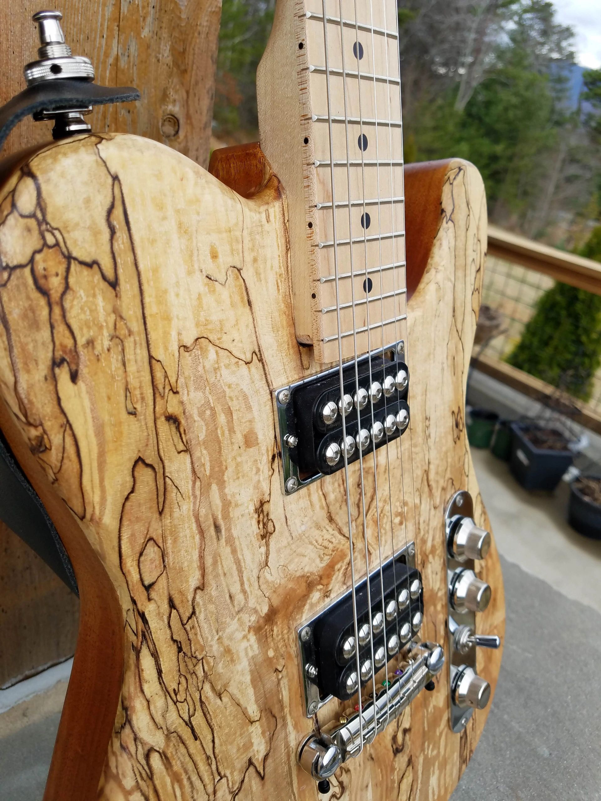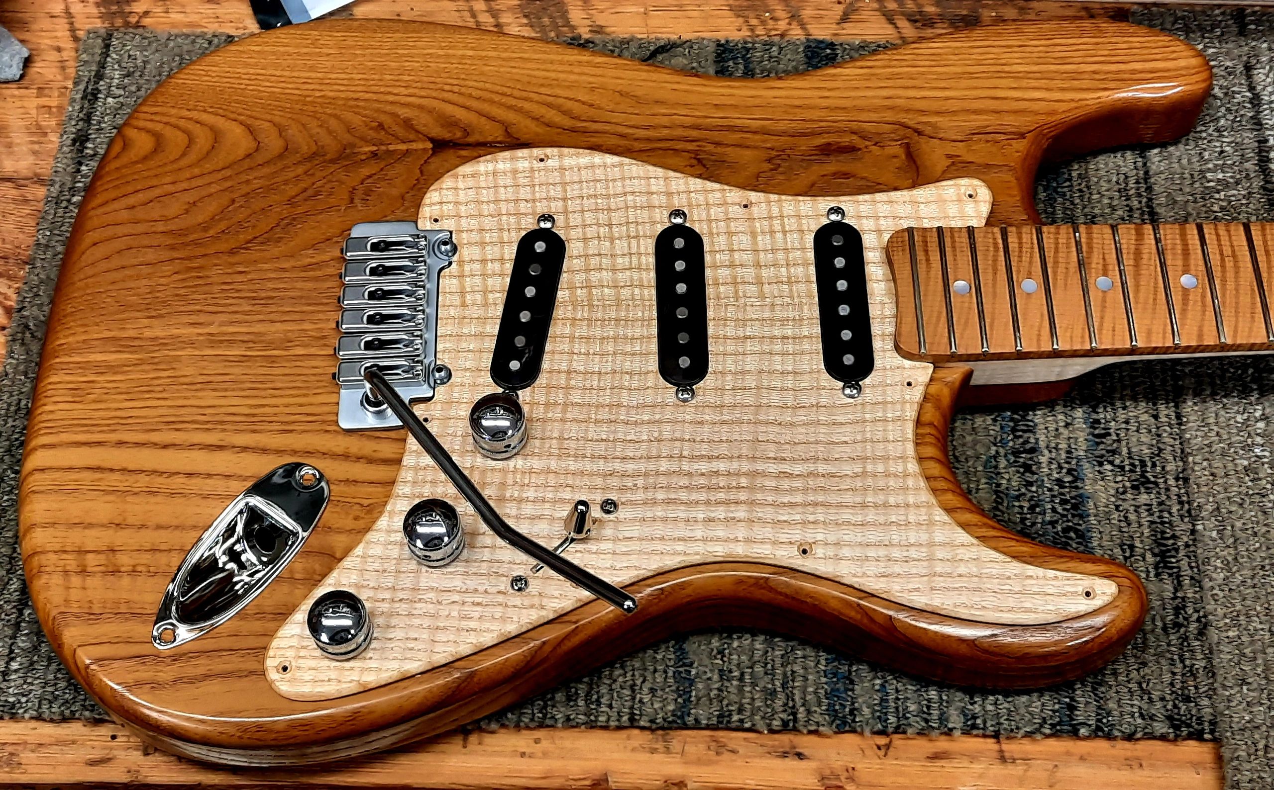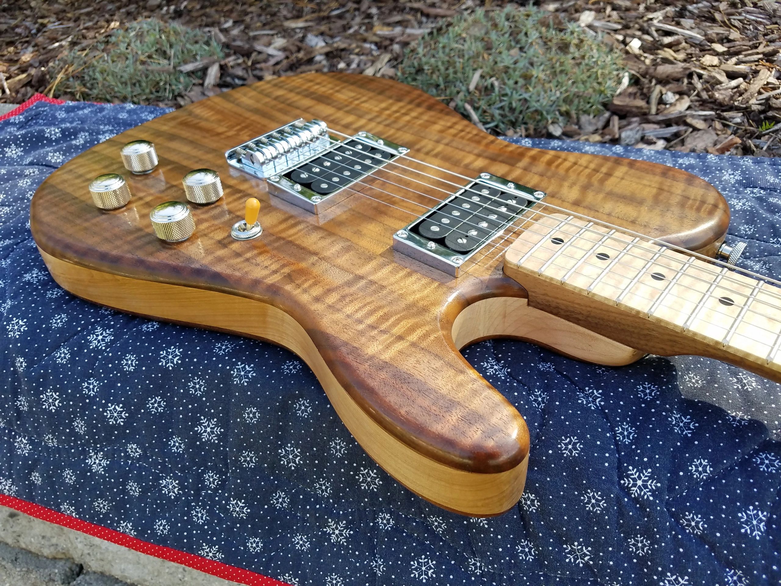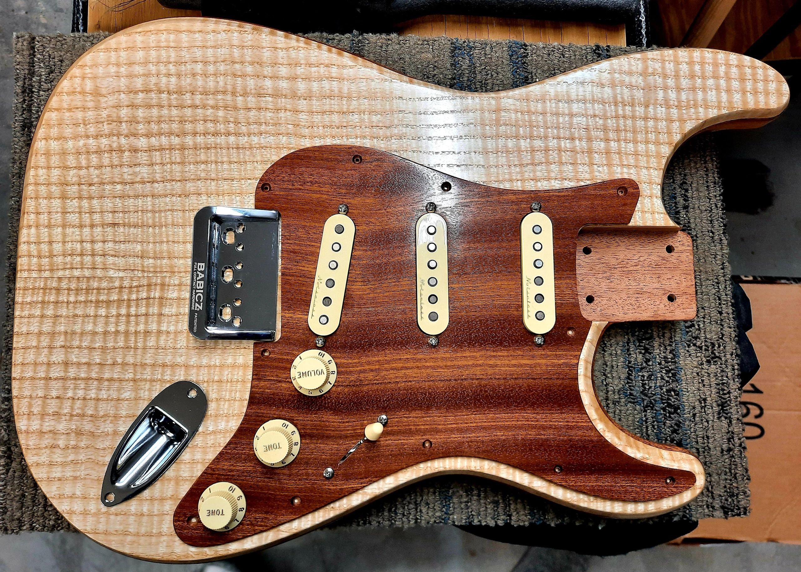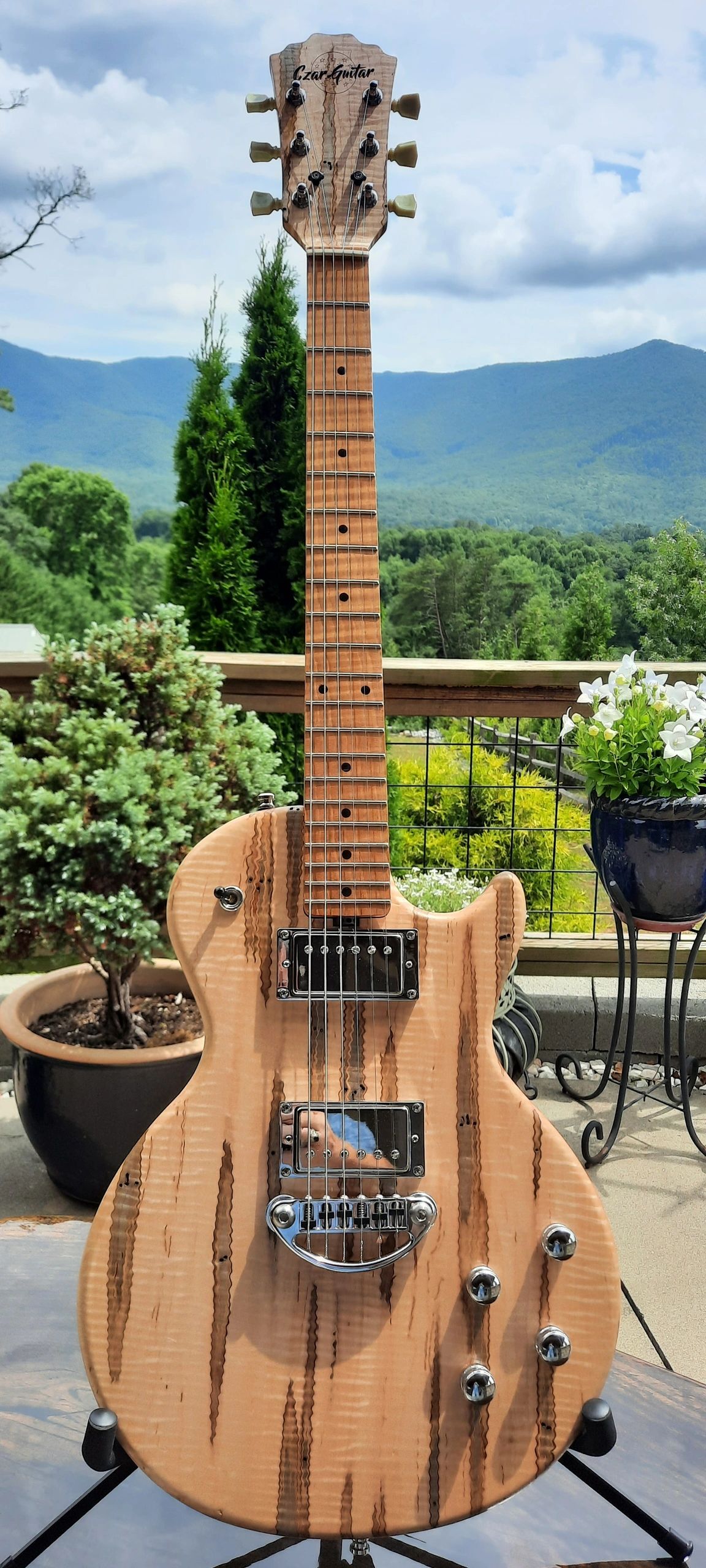 #26 Flame ash on flame roasted maple, Warmoth roasted maple neck, sapele pickguard, 6-way switch, push pull coil split
