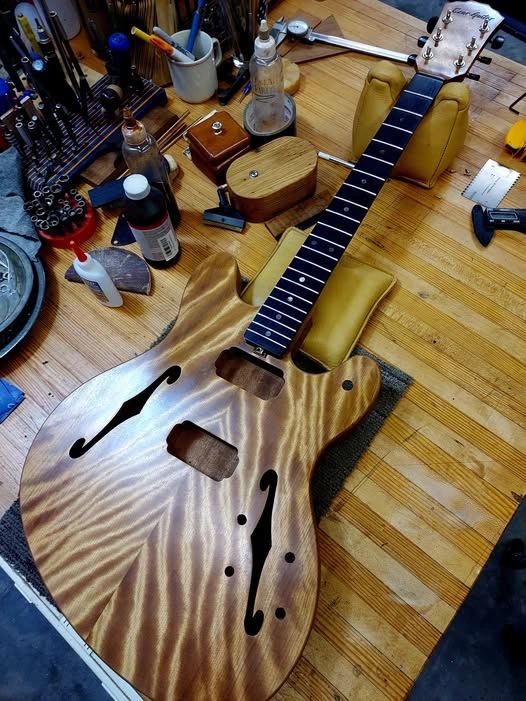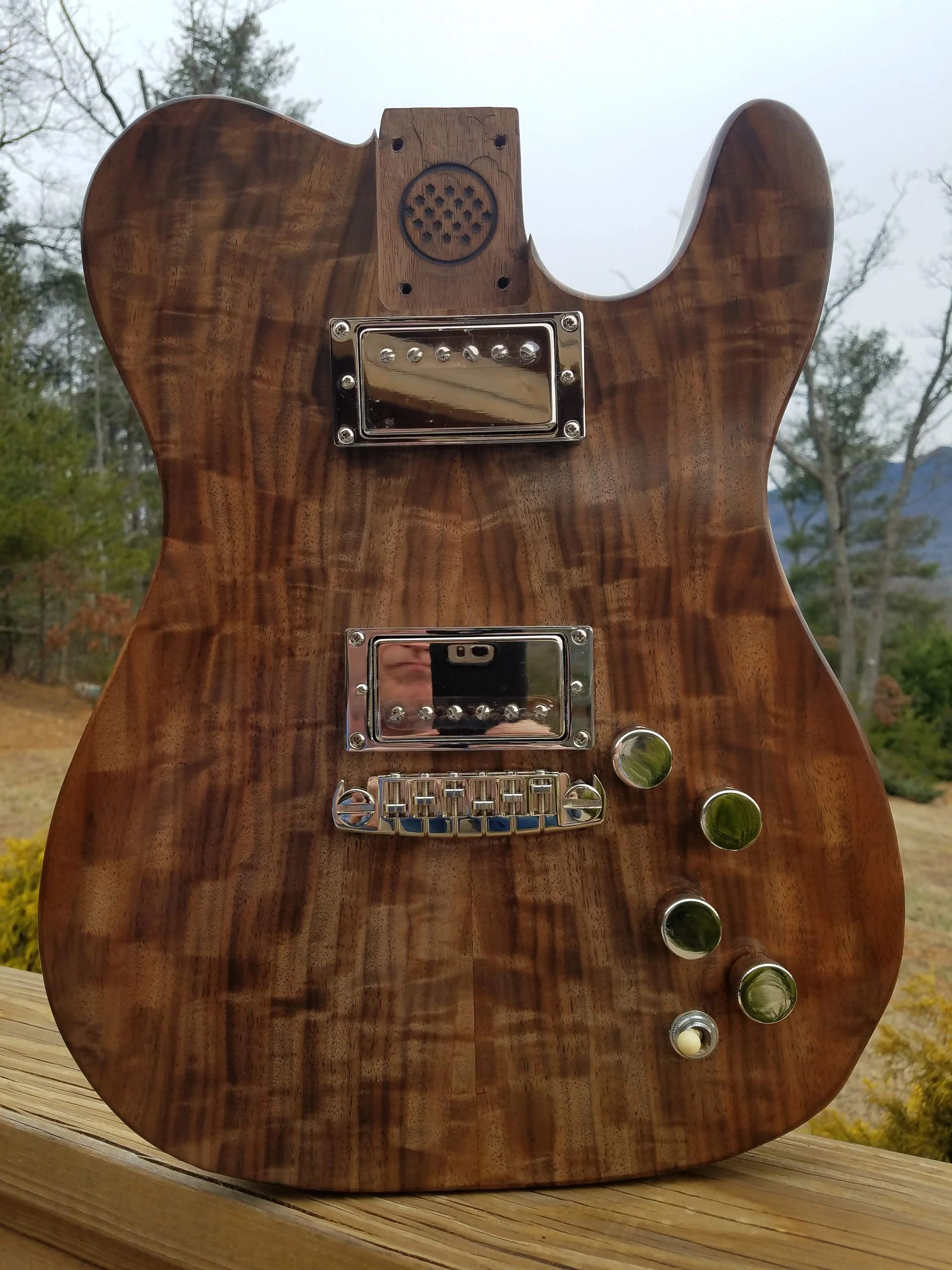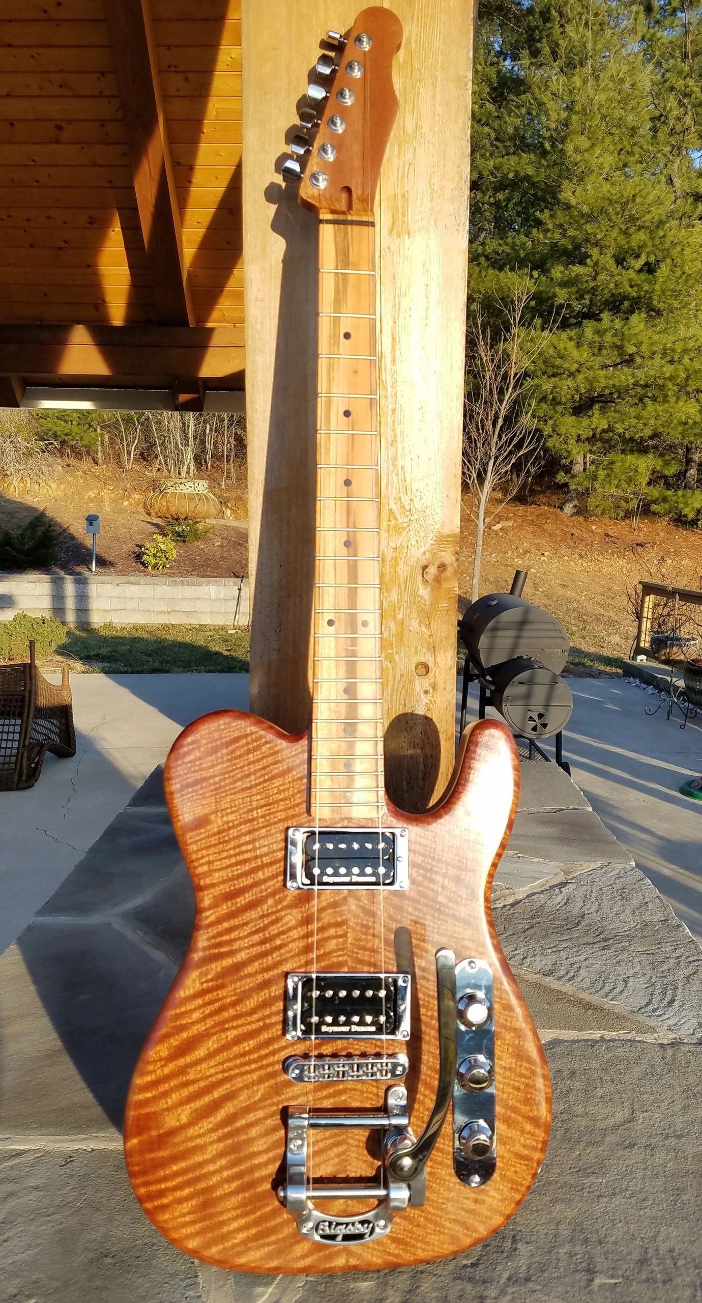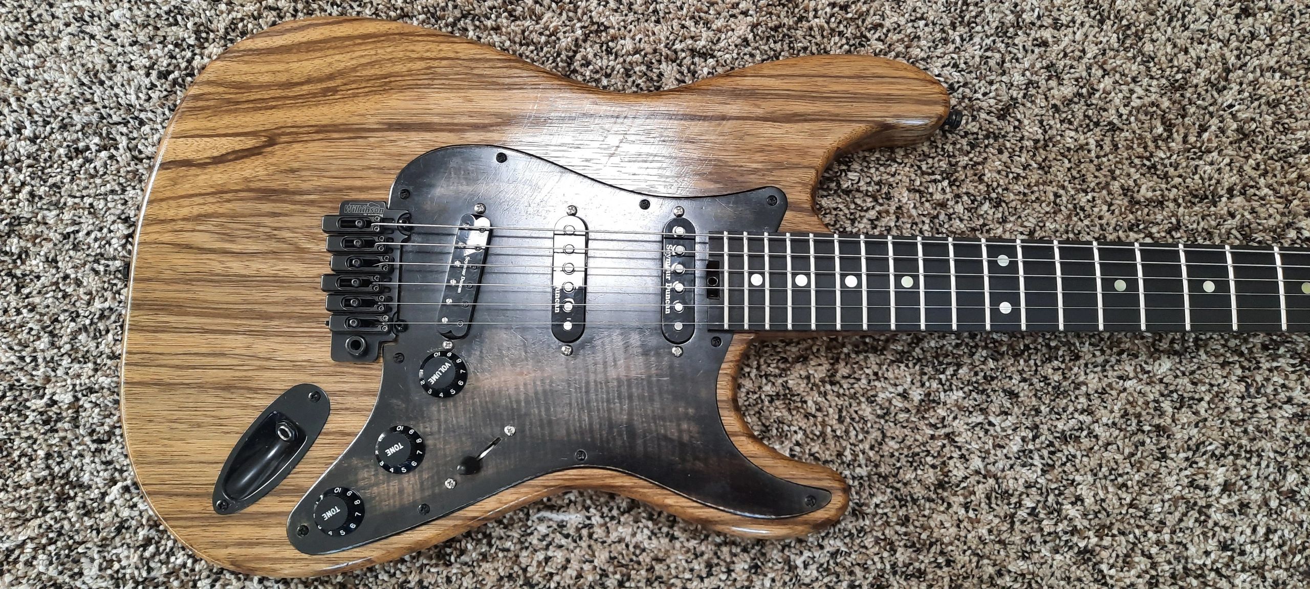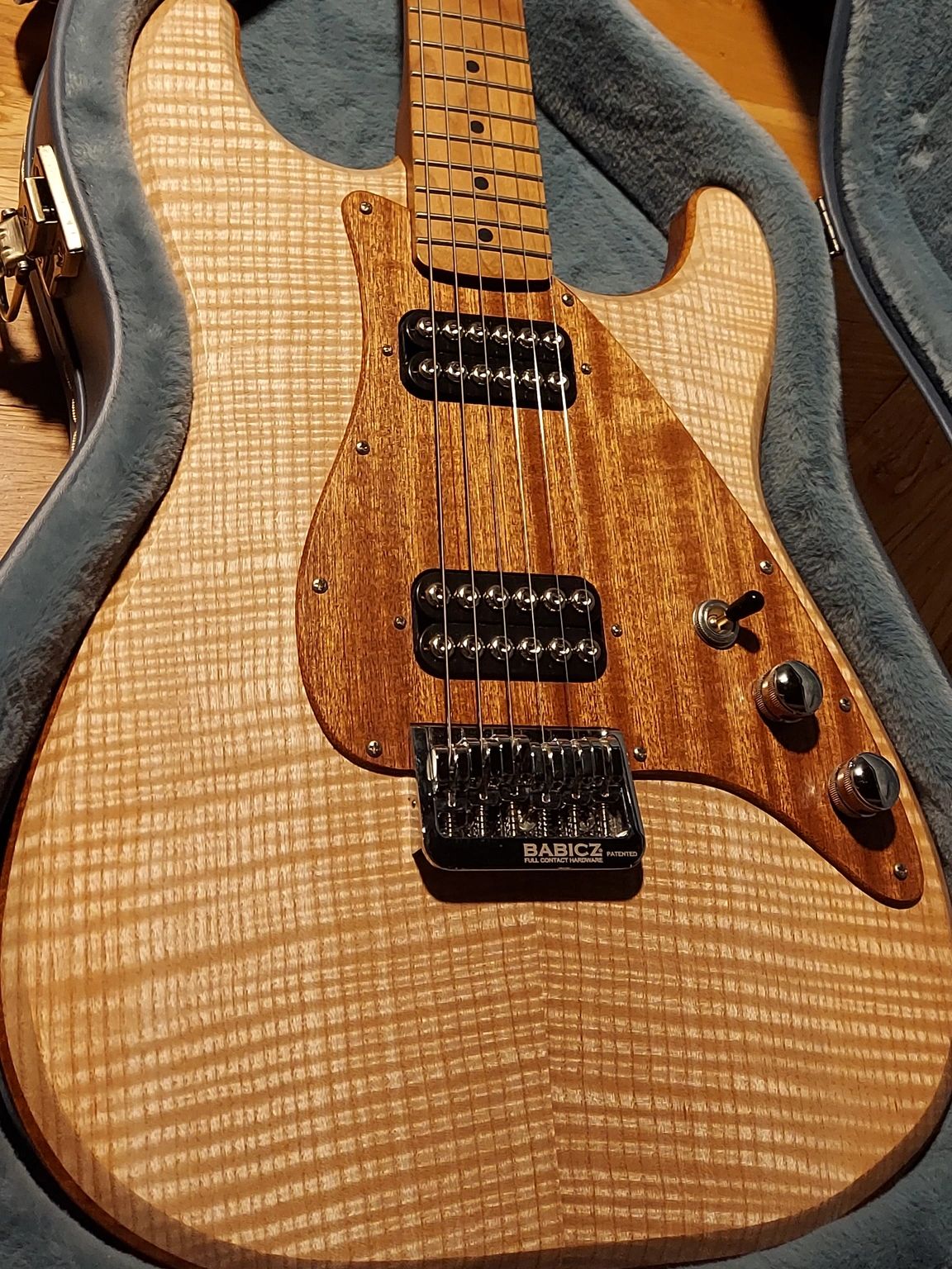 #26 Flame ash on flame roasted maple, Warmoth roasted maple neck, sapele pickguard, 6-way switch, push pull coil split