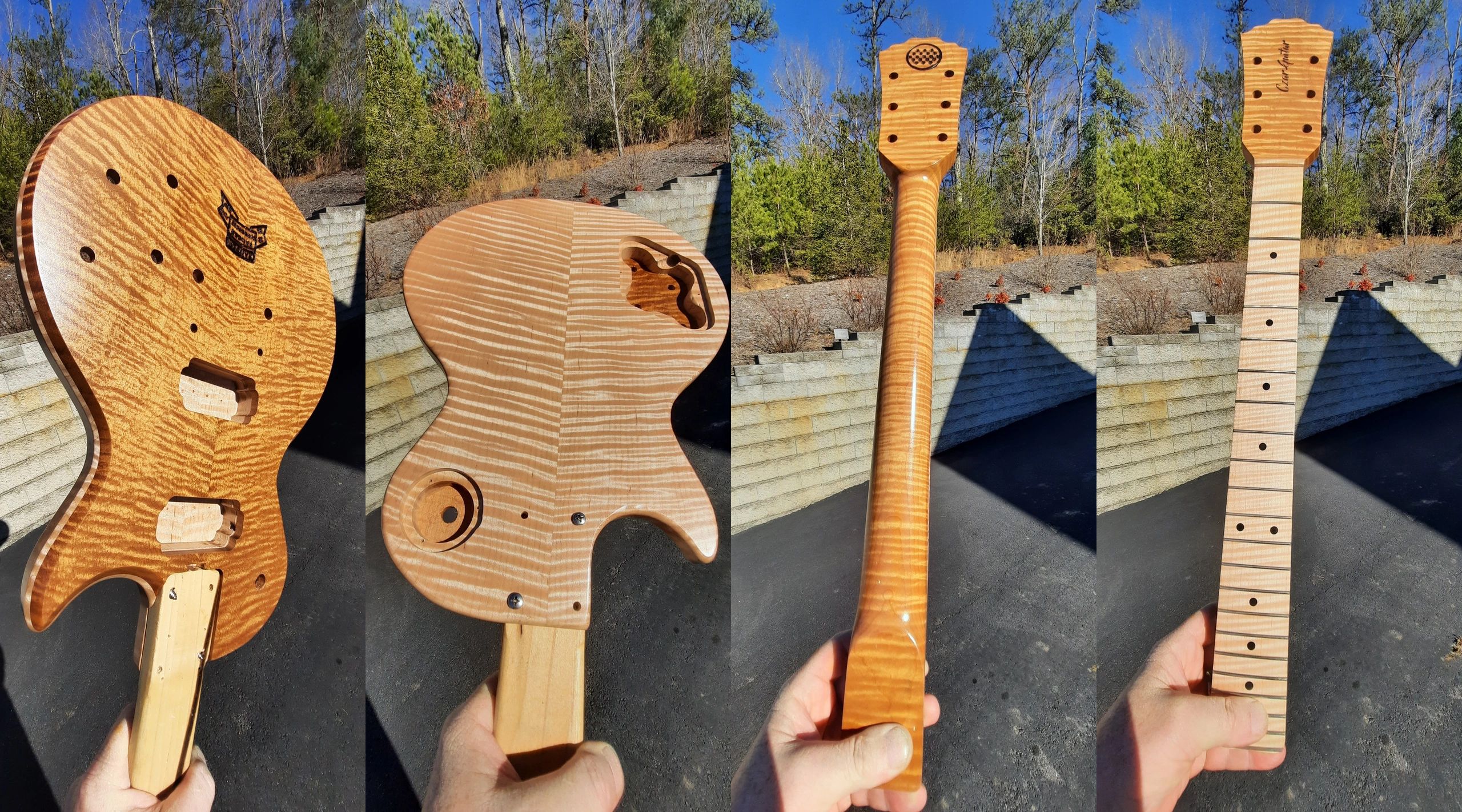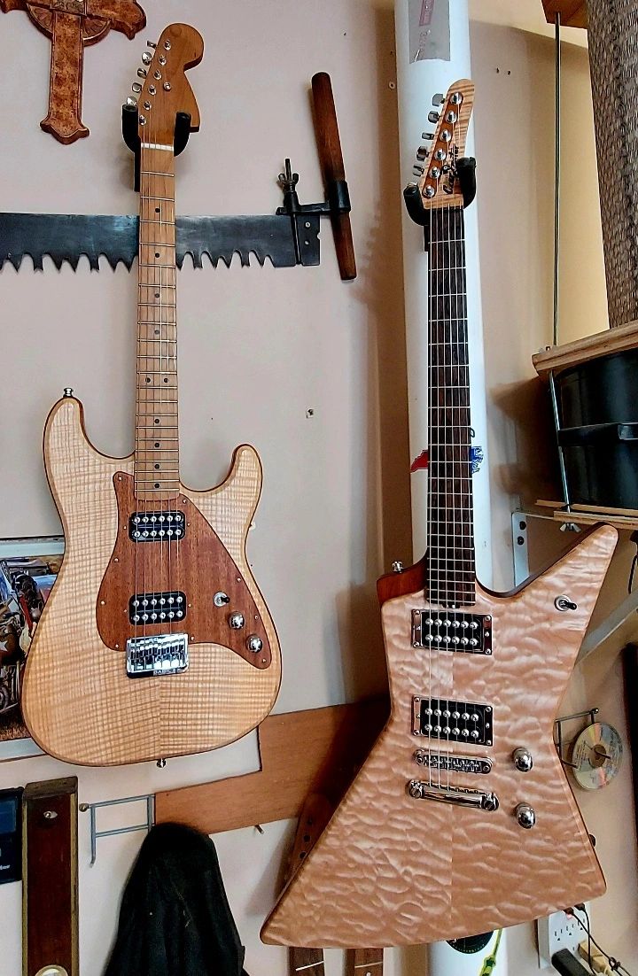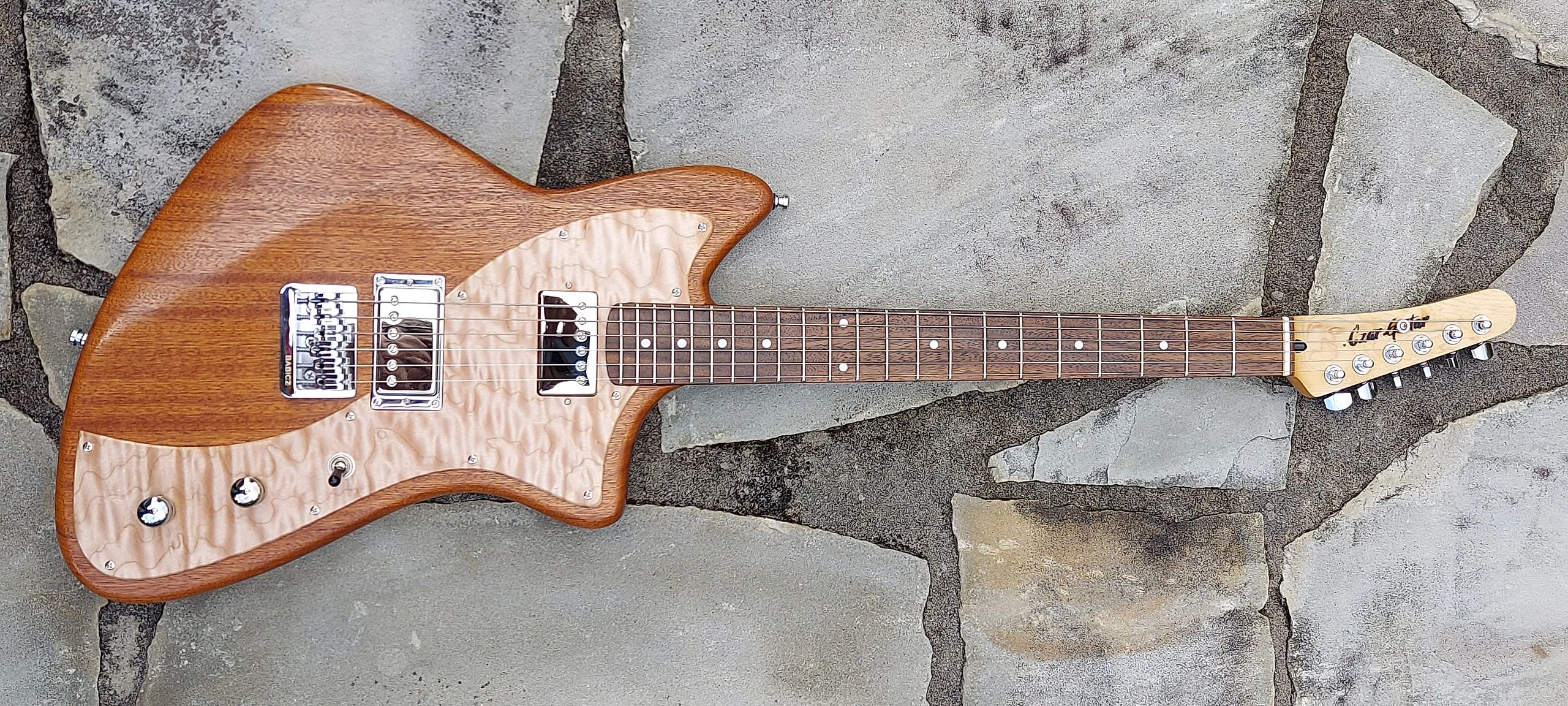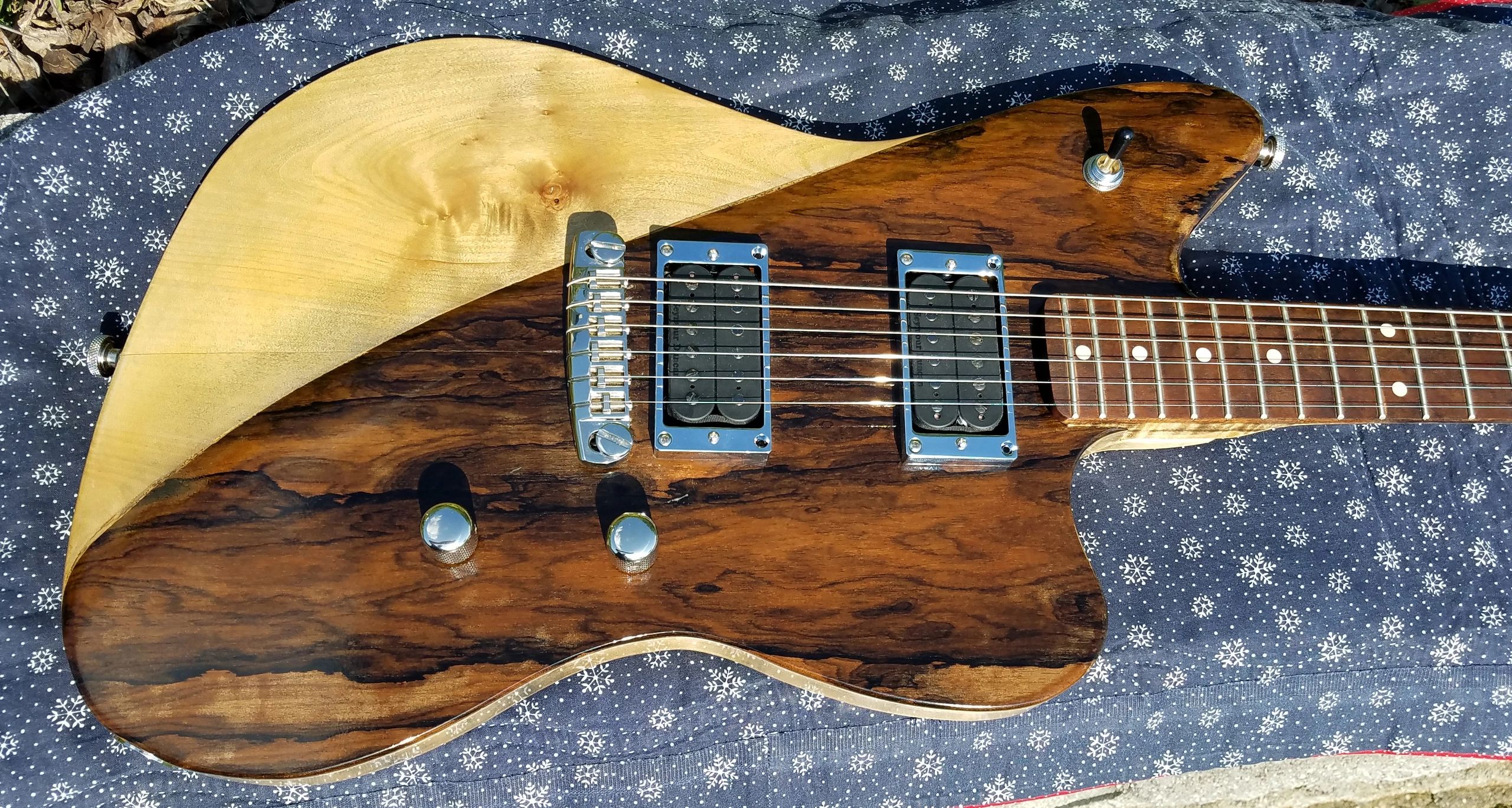 #27 Quilted maple on sapele Explorer, 6-way switch, ziricote fretboard, DaVinci tuners